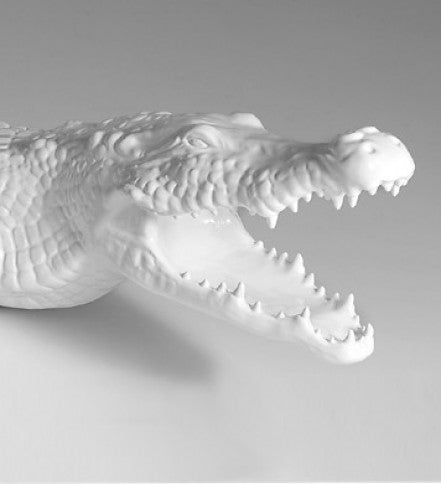 Statua coccodrillo in ceramica bianco lucido.