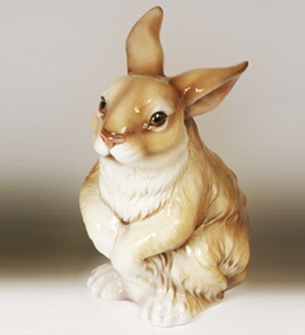 Coniglio portascopino in ceramica decorato a mano, colore rosso, compreso di scopino in PPL.