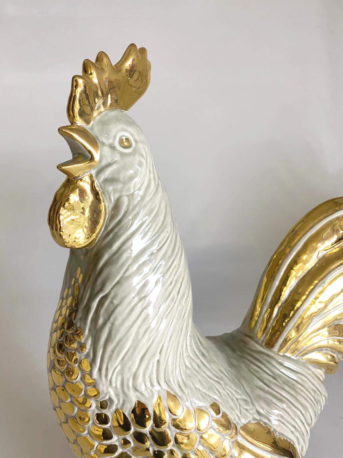 Tradizionale statua di Gallo h 47cm in elegante finitura bianco patinato con dettagli placcati oro, che donano un aspetto innovativo e moderno ad un oggetto della tradizione della ceramica di Bassano. La base è in vernice craquele che crea un evidente reticolo sulla cristallina in alcuni punti, donando un maggior effetto anticato. Il gallo viene rifinito con abbondanti pennellate in oro 24k che lo rendono un oggetto di lusso, adatto ad antiche dimore ed allo stesso tempo ad ambienti minimalisti che vogliano puntare sui contrasti e sull' eccentricità. Pezzo unico, in offerta promozionale.