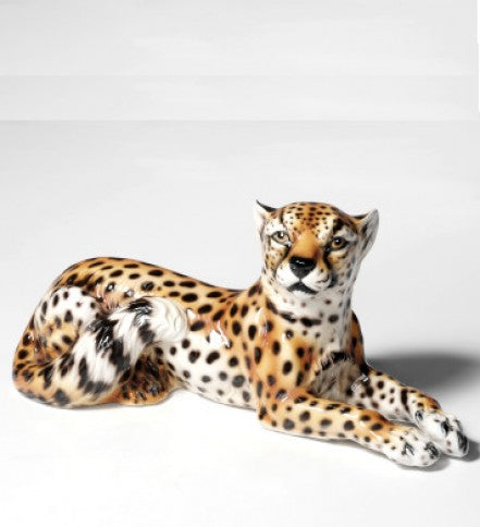 Statua di ghepardo sdraiato in ceramica, adatta come soprammobile / centrotavola date le dimensioni contenute ma sufficienti per donare ad un mobile un tocco esotico.